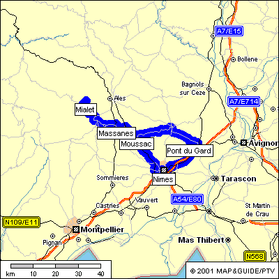 Der nächste Tag brachte uns zum Pont du Gard, dem mächtigen 2000 Jahre alten Aquädukt römischer Baukunst. Er leitete das Quellwasser des Eure von Uzes über 50 km nach Nîmes.